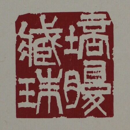 故西浦壽碩作品 「培腹蔵珠」 腹中に珠玉を隠しおさめる。(『紅楼夢』45回“你自己手里拿着这个,岂不好?---就失了手也有限的,怎么忽然又变出这培腹蔵珠的脾气来。”)また、門外不出の秘伝(请李渔「闲情偶寄」"以词曲相传着,犹不及十一,盖千百人一见着也。凡有此能者,悉皆培腹蔵珠,无求 自秘.谓此法无人授我,我岂独肯传人") 額 印7×7.5